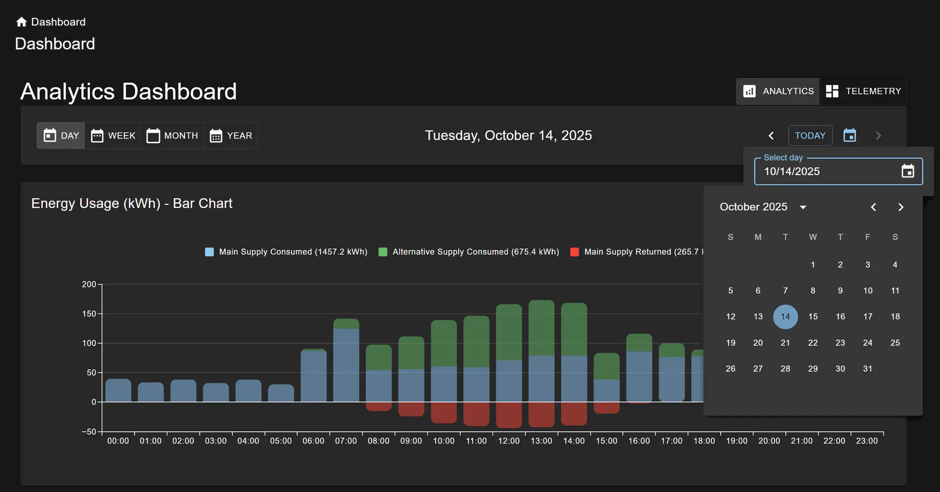 - Power consumption graphs for various periods (daily, weekly, monthly).