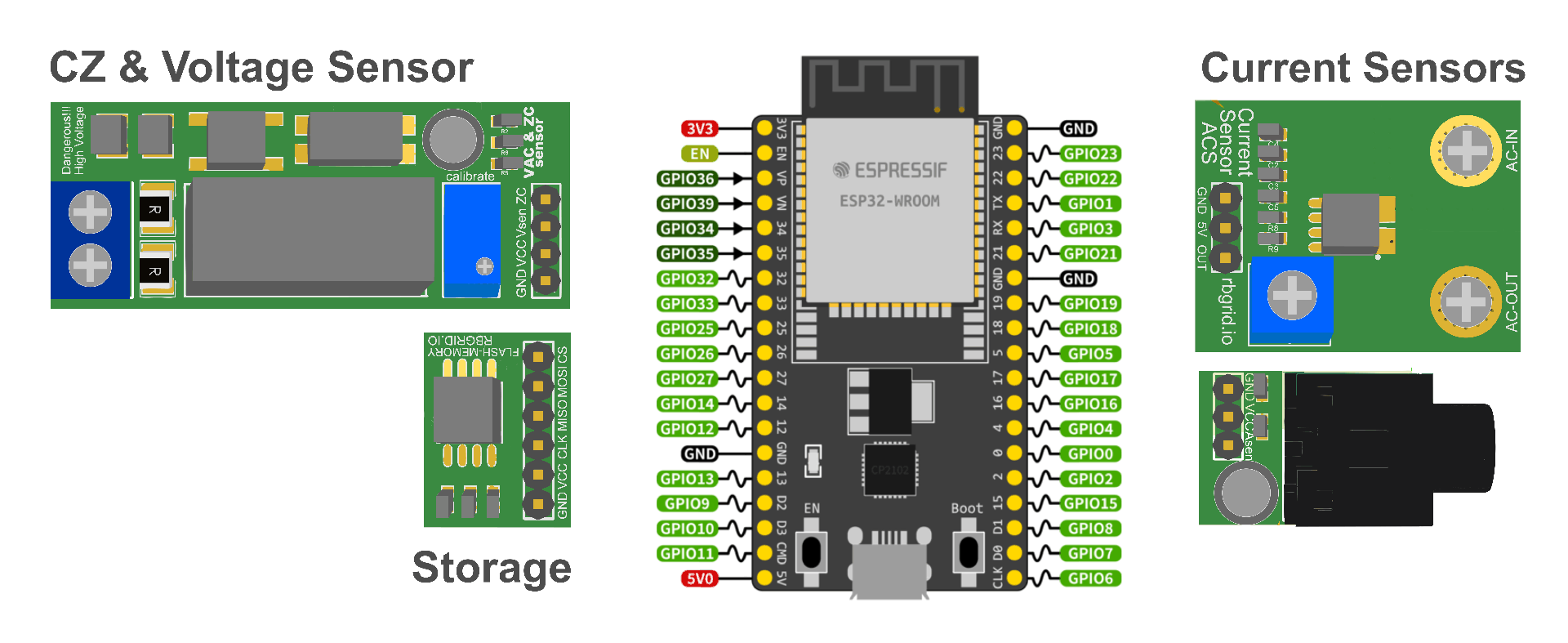 This combined module is the absolute minimum requirement for any RBgrid deployment. It provides critical grid synchronization through zero-cross detection and accurate voltage measurement - two fundamental functions that enable all other measurements.