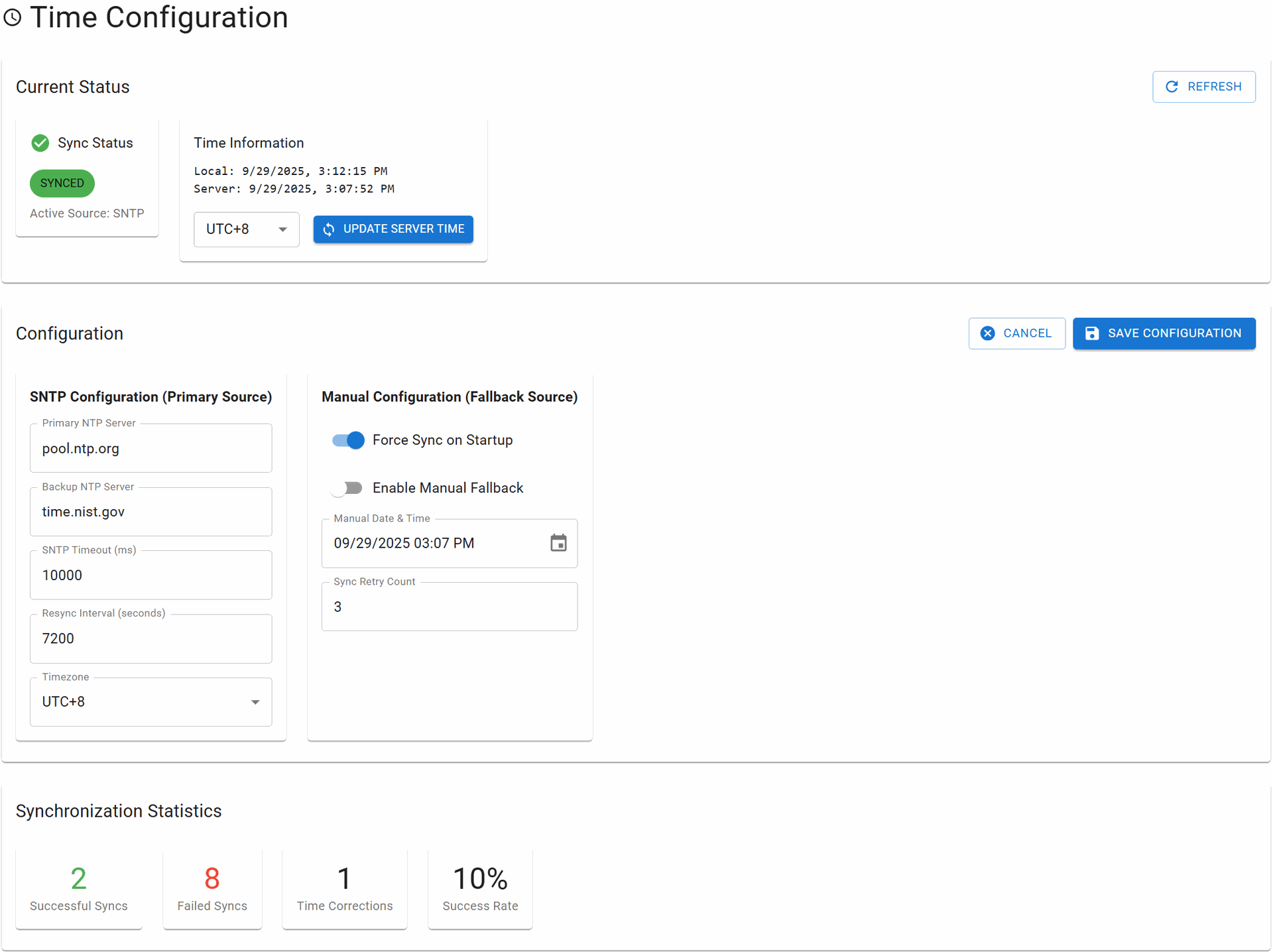 The Time Configuration page manages system time synchronization for the RBgrid power measurement device. Accurate timekeeping is critical for proper system operation, affecting tariff calculations, statistical data storage, device synchronization, and scheduled operations.